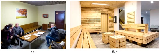 Drewniana poczekalnia w Narodowym Instytucie Onkologii: ( a ) przed przebudową; ( b ) po przebudowie w 2016 r.